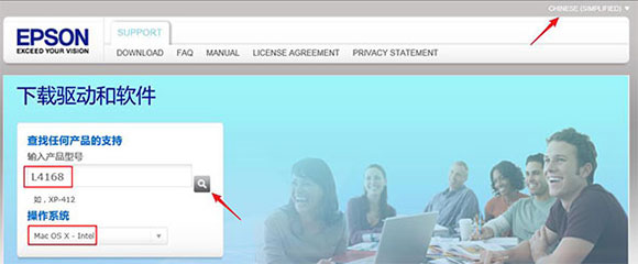 第一步:點擊(此處)登錄下載中心,輸入產品型號→選擇操作係統→點擊搜索(放大鏡)按鈕。